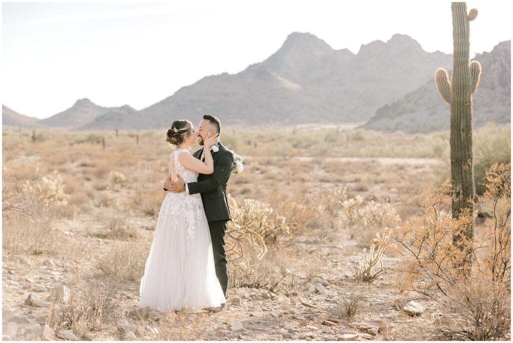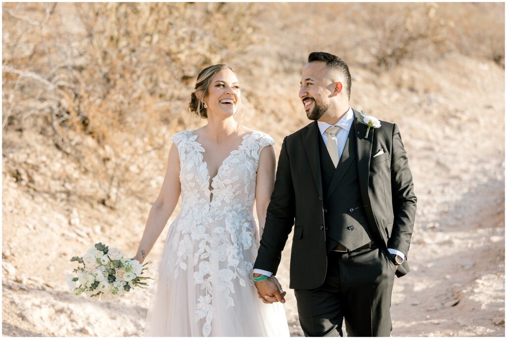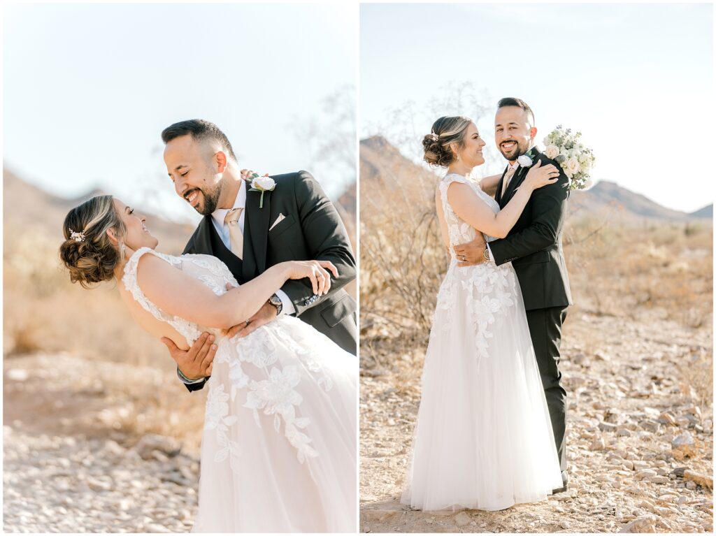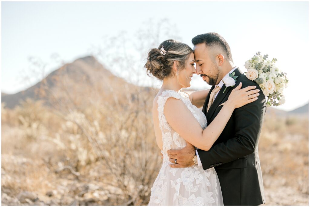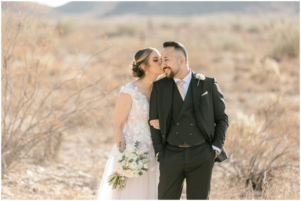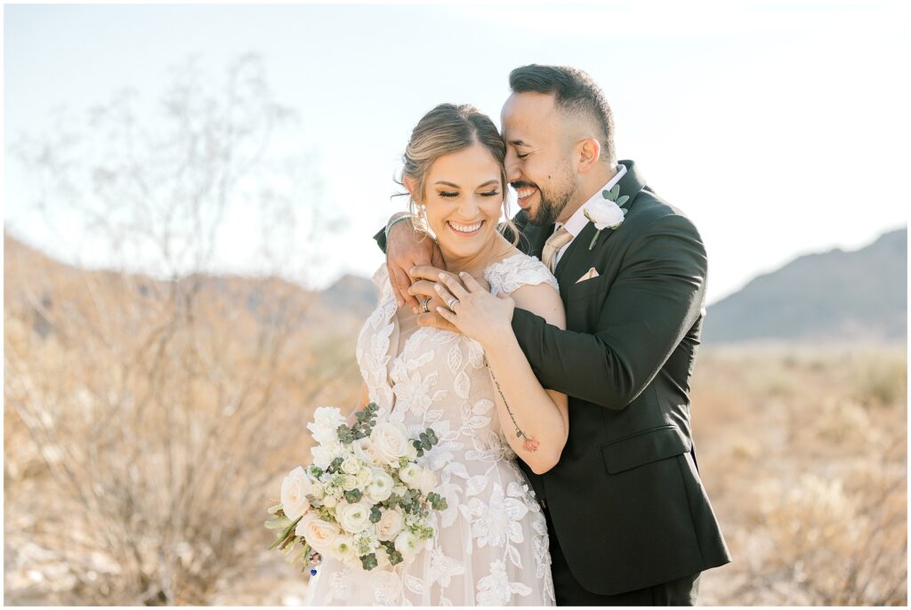After saying “I do,” we made our way to the Arizona desert for bride and groom portraits. Against the soft, golden landscape, Erin’s elegant white bouquet, featuring cabbage roses and eucalyptus, popped beautifully against her classic gown. Their black, white, and olive green color palette complemented the natural scenery perfectly, making for romantic portraits before heading to their reception.