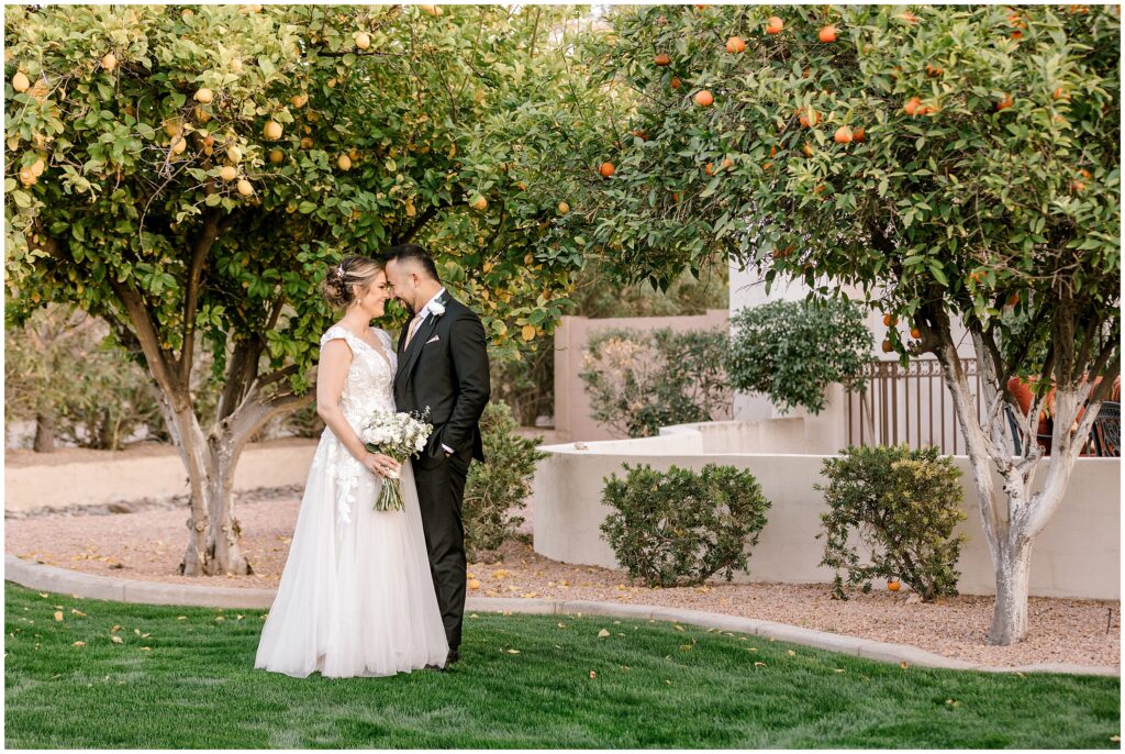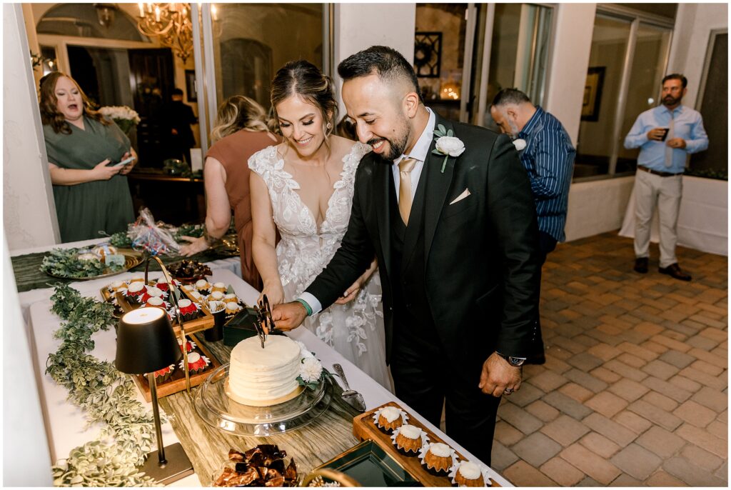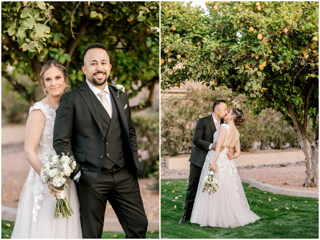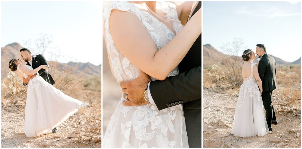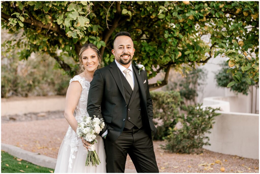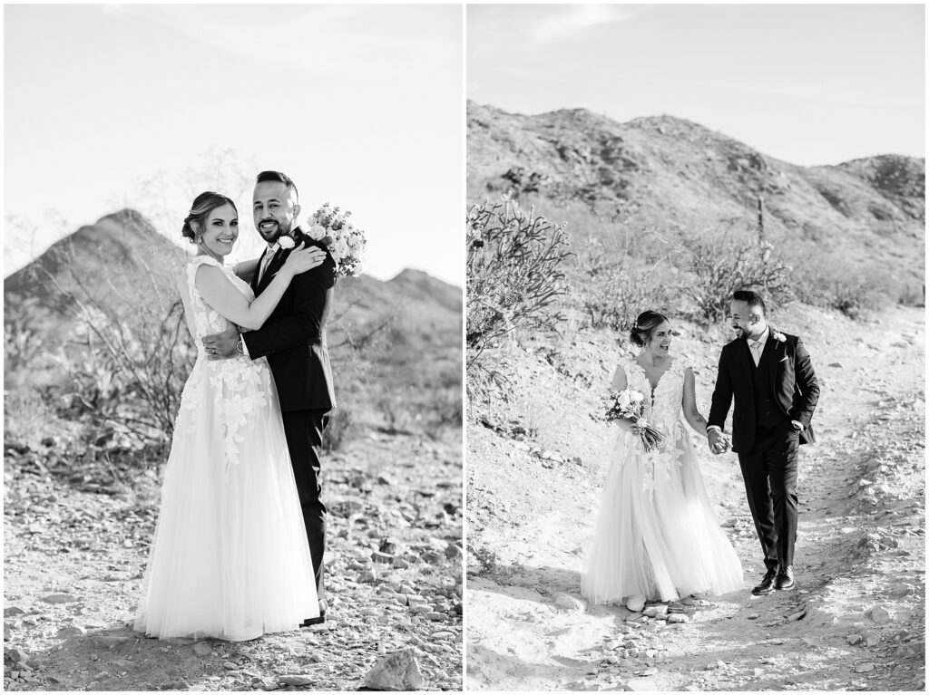 After saying “I do,” we made our way to the Arizona desert for bride and groom portraits. Against the soft, golden landscape, Erin’s elegant white bouquet, featuring cabbage roses and eucalyptus, popped beautifully against her classic gown. Their black, white, and olive green color palette complemented the natural scenery perfectly, making for romantic portraits before heading to their reception.