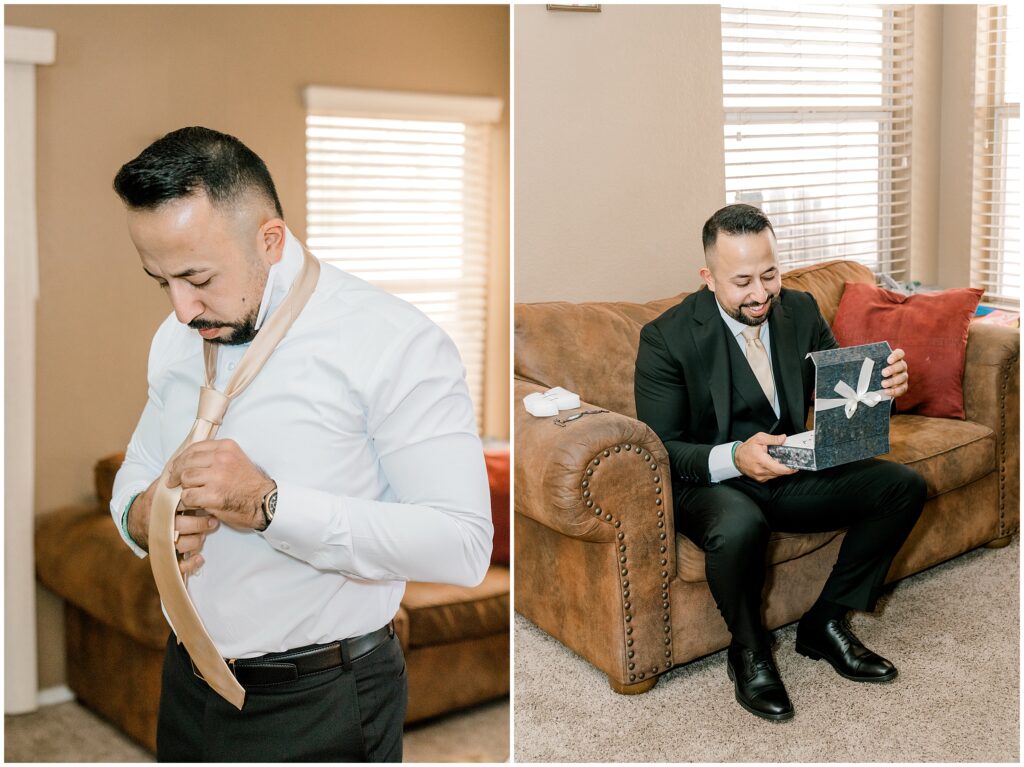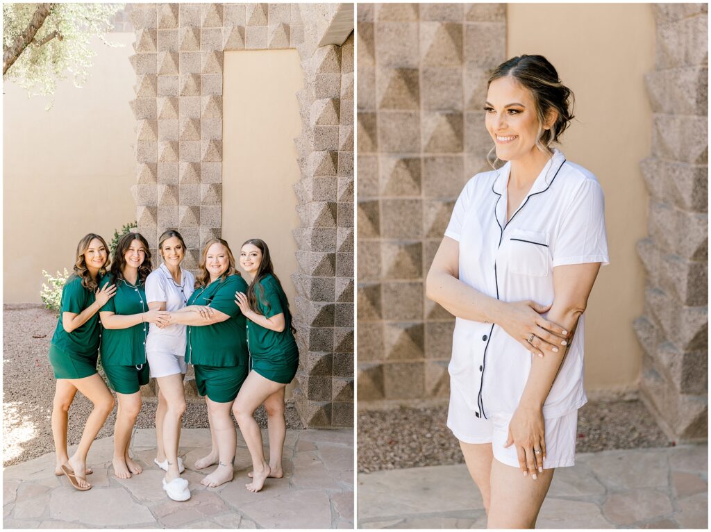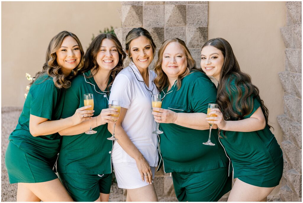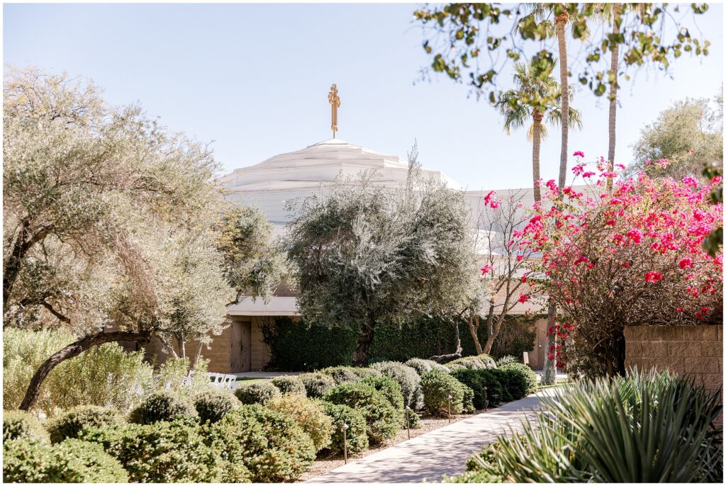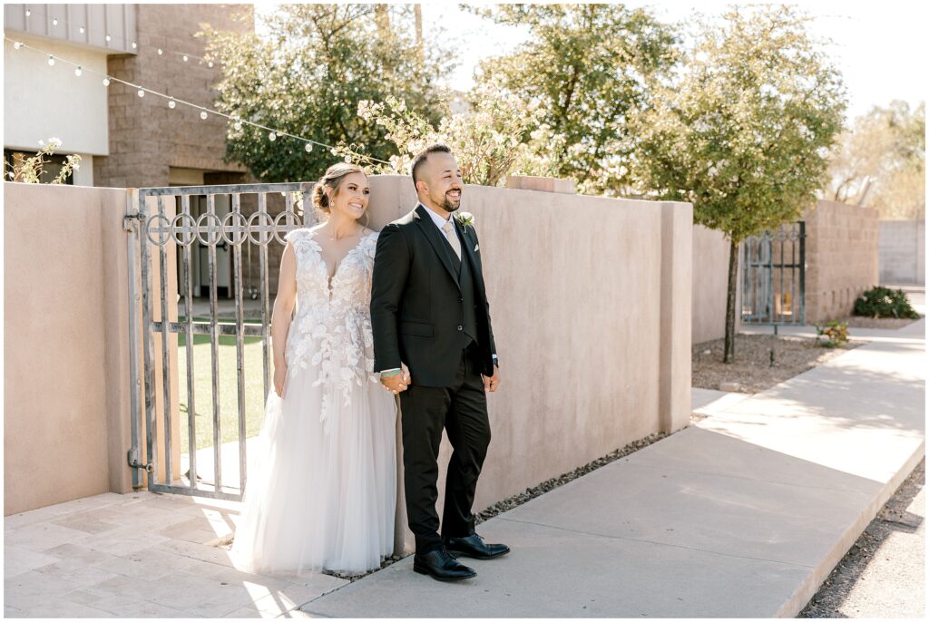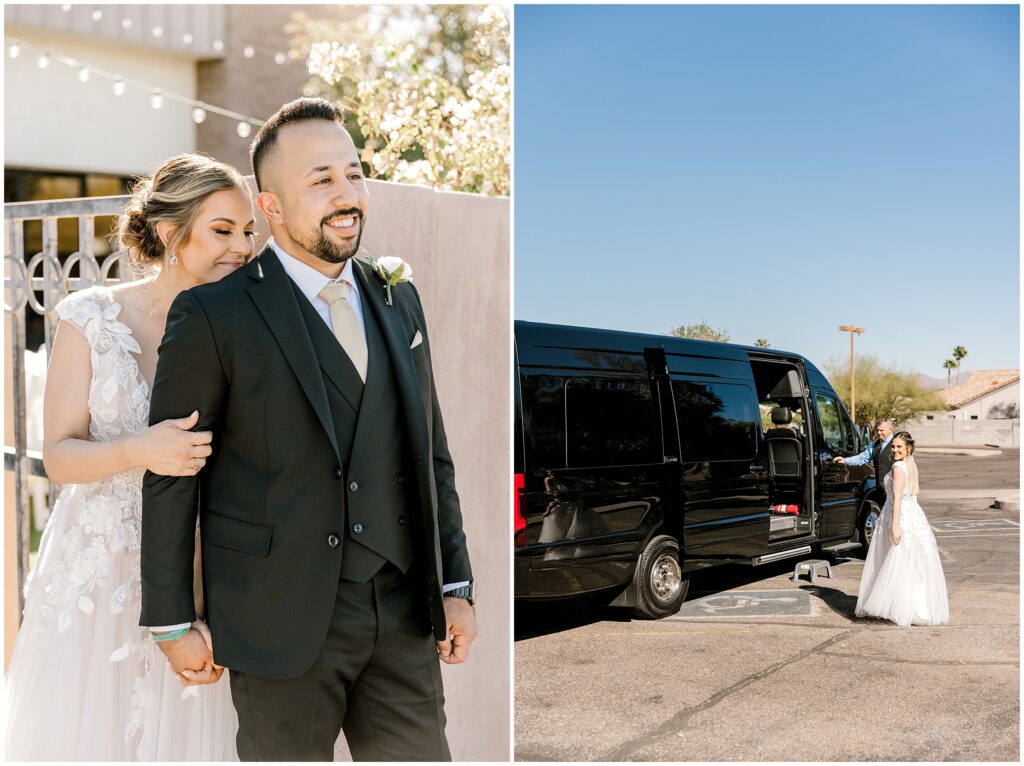 After saying “I do,” we made our way to the Arizona desert for bride and groom portraits. Against the soft, golden landscape, Erin’s elegant white bouquet, featuring cabbage roses and eucalyptus, popped beautifully against her classic gown. Their black, white, and olive green color palette complemented the natural scenery perfectly, making for romantic portraits before heading to their reception.