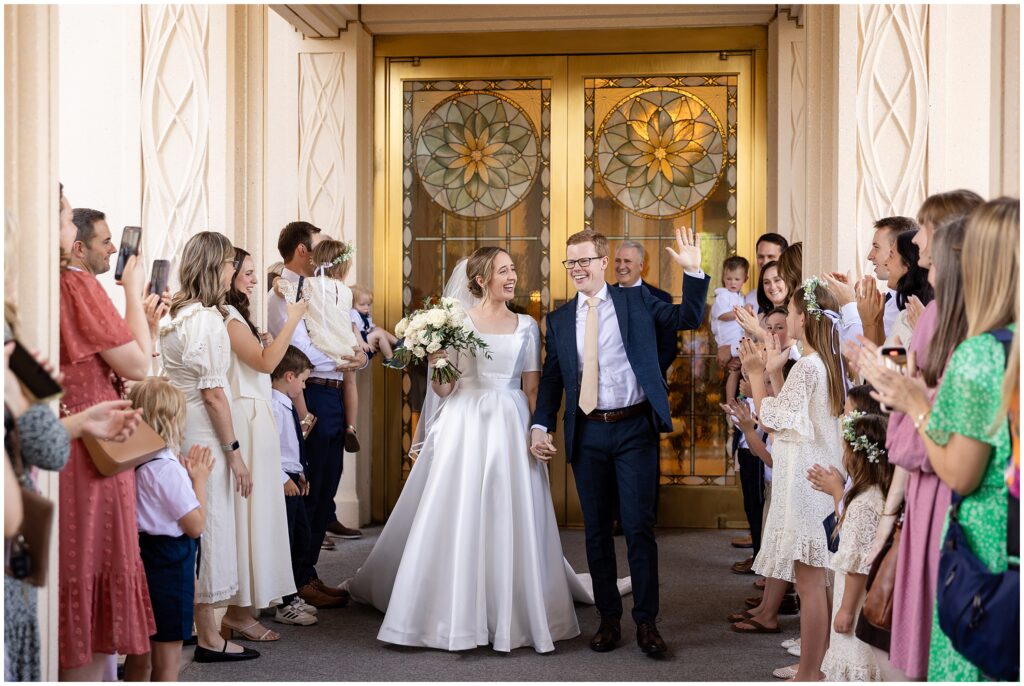 When the wedding day arrived, everything felt peaceful and full of purpose. We started coverage at the temple as Sarah and Nate exited in the afternoon, greeted by a tunnel of cheering friends and family ready to celebrate their new beginning. It was such a sweet, joyful moment full of hugs, happy tears, and so much love. We stayed at the temple a bit longer for some family portraits and a few more shots of the newlyweds before heading to the reception.