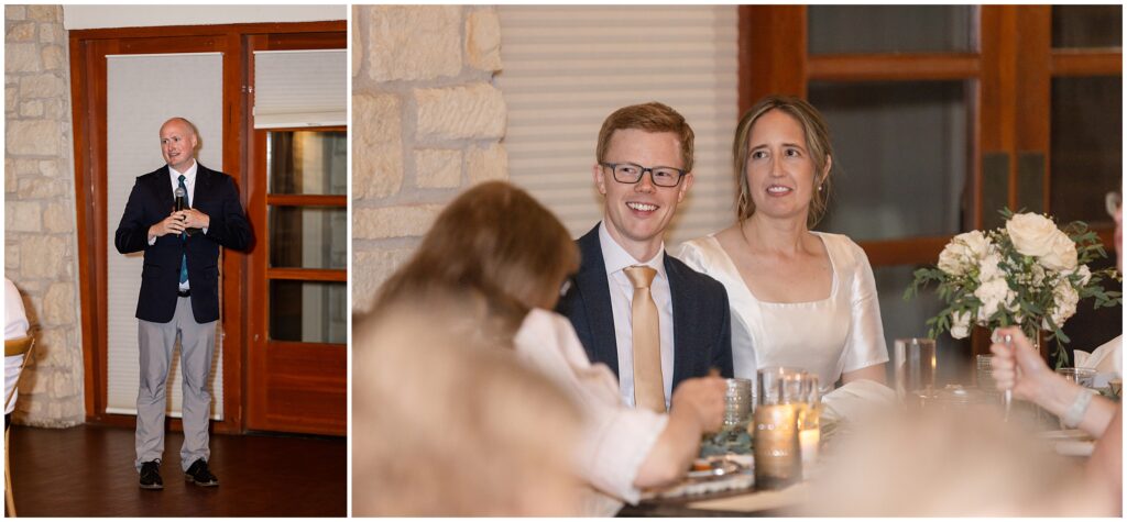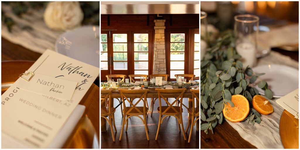 The reception took place at Ocotillo Golf Club, and it was such a lovely setting for their intimate gathering of close friends and family. The space was styled with timeless greenery and modern touches of citrus throughout the tablescapes—fresh, elegant, and full of personality. Each place setting included beautifully designed programs and menus, a thoughtful detail that made the evening feel extra special.